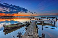 Prachtige zonsondergang boven het Zuidlaardermeer in Nederland met reflecties in het water en op de voorgrond een half verzonken bootje die aan een steiger aangemeerd ligt.