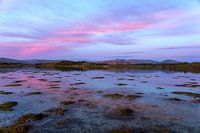 Een prachtige zonsondergang boven het kraakheldere, ondiepe water van de zee in Helgeland, Noorwegen.