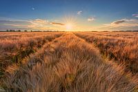 De kleuren van de graanvelden lichten op in de avondzon boven het Zuid Hollandse platteland. Het zicht rijkt kilometers ver over het vlakke land van Goeree-Overflakkee met zijn oneindige horizon.
