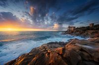 Kasteel Boccale en de zandstenen rotsen van Romito tijdens een storm bij zonsondergang. Livorno, Toscane, Italië, Europa