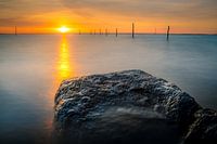 Deze foto een ondergaande zon is gemaakt aan de buitenkant van de IJsselmeer dijken in de Noordoostpolder. Ten hoogte van Lemmer heb je een prachtig eindeloos uitzicht en staan vele visnetten en fuiken opgesteld langs de randen van de dijk. In de voorgrond bassalt stenen die vervreemdend lijken door het gebruik van een lange…