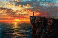 Deze unieke kunst toont een indrukwekkend tafereel van een eenzame figuur die op een hoge klif staat met uitzicht op een betoverende zonsondergang. De krachtige kleuren oranje, rood en geel, gecombineerd met diepe tinten zwart en blauw, creëren een sfeer van emotie en reflectie. Dit ontwerp is perfect voor liefhebbers van moderne kunst en zal prachtig staan in een woonkamer of slaapkamer. Het roept gevoelens van avontuur, eenzaamheid en vrijheid op, en vormt een statement aan elke muur. Een prachtige keuze voor wie de schoonheid van de natuur en menselijk silhouet wil vieren.