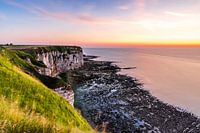 Vooraan op de eerste rang ziftten tijdens een prachtige zonsondergang op een hoge klif aan de kust bij Normandië