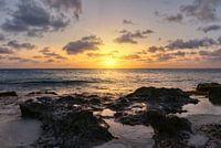 Deze sfeervolle foto is genomen tijdens het gouden uur op Pink Beach, een van Bonaire’s meest geliefde plekken. De zon zakt langzaam in de Caribische Zee, terwijl haar warme licht de hemel vult met tinten goud, amber en zacht violet. Op de voorgrond contrasteren de donkere vulkanische rotsen scherp met de zachte gloed van de zon. In de…