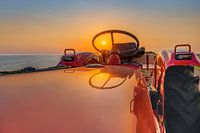 Zonsondergang aan de rand van het IJsselmeer vlak onder Stavoren gezien door het stuur van een rode trekker welke geparkeerd stond bij de Reade Klif in Friesland