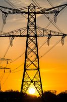 Electriciteitsmast doorkijk en de zonsondergang in de Zuidlanden van Leeuwarden, Friesland.