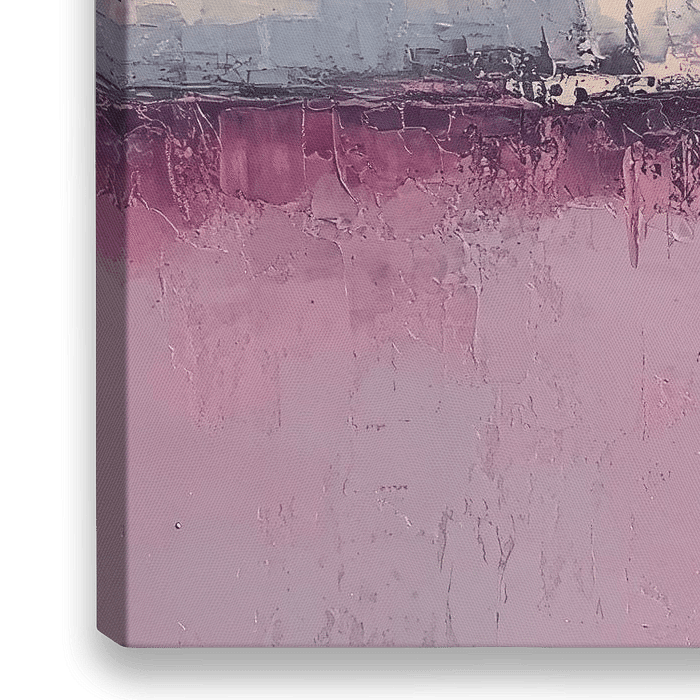 Zonsondergang en Reflectie Abstract - Dit abstracte schilderij kenmerkt zich door een horizonlijn gescheiden door rijke, roze en paarse tinten, wat een rustgevend maar krachtig stadsgezicht oproept met de illusie van een zonsondergang die weerspiegeld wordt in water.