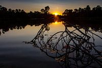 Zonsondergang Van Esschenven in de Oisterwijkse Bossen en Vennen. Tak in het water en eilandjes met bomen in de herfst. Prachtige weerspiegeling in een windstil water.