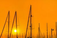 Zonsondergang met een oranje gloed op een stille zomeravond boven de haven van het Friese havenstadje Stavoren gelegen aan het IJsselmeer.