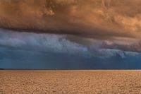De oranjegloed van de zonsondergang boven het Wad bij Harlingen met een stevige bui aan de horizon zorgde voor een oranje/blauw spektakel. Nog net een laatste zeilschip aan de horizon.