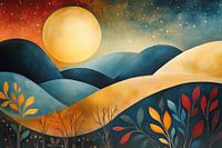 Een levendig landschap met glooiende heuvels onder een stralende, te grote zon, badend in een spel van warme en koele kleuren, straalt met een warme gloed. De silhouetten van planten en bomen vallen op in de voorgrond en vormen een contrast met de subtielere achtergrond. De scène combineert natuurlijke elementen met een abstracte,…