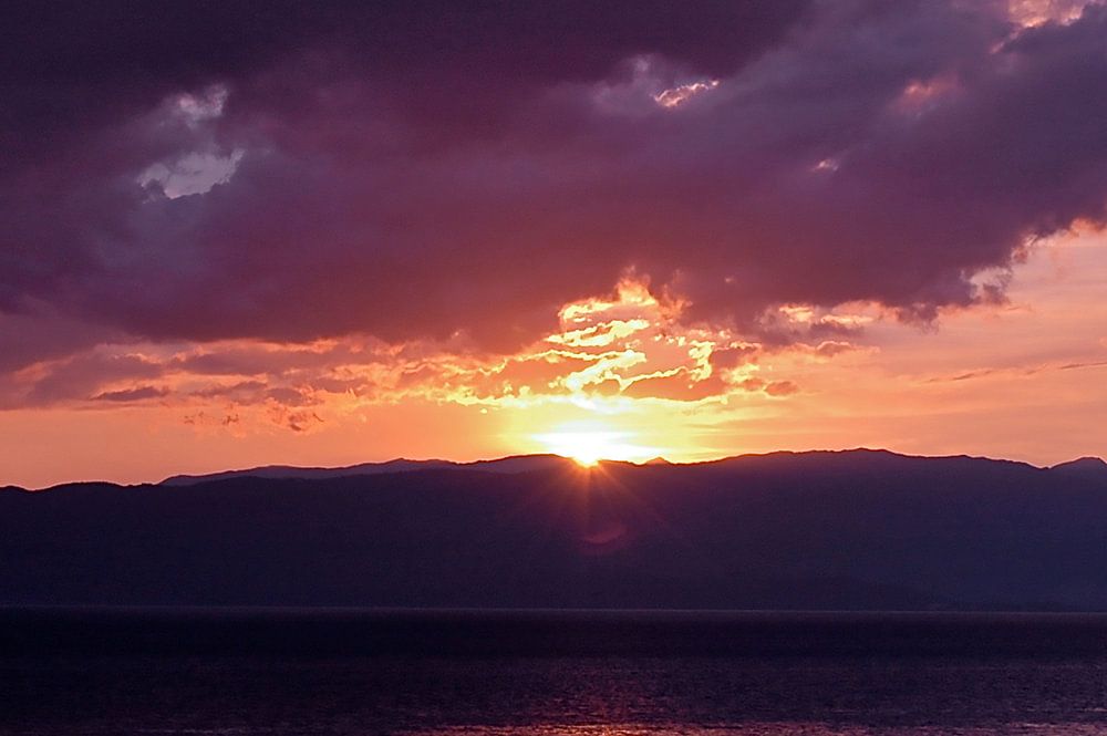 Ina Hölzel fotografie. We waren getuige van een prachtige zonsondergang aan het meer van Ohrid in Macedonië. De lucht kleurde prachtig van licht naar donker tot de zon achter de bergen verdween. Een mooi spektakel.