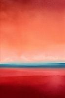 Een abstract kunstwerk waarin warme koraalrode tinten domineren, onderbroken door een subtiele turquoise horizontale lijn die het werk in tweeën deelt. De kleuren vervloeien zacht in elkaar, wat een dromerige, bijna mystieke sfeer creëert. Het werk straalt rust uit en doet denken aan een gestileerde zonsondergang boven een oneindige…