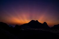 Deze spectaculaire zonsondergang hebben we geschoten in Spitzkoppe National Park, Namibië. Een waanzinnig kleurenspectakel van de zon die achter de bergen zakt. Het is goed te zien hoe de zonnestralen de laatste momenten van de dag kleuren. Dit kleurrijke werk straalt rust uit en je blijft er naar kijken. Een gave foto voor bijvoorbeeld…