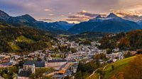Een 16:9 foto van een zonsondergang in de herfst van Berchtesgaden, een oude stad in het zuidoosten van Beieren, Duitsland, dat gelegen is in het dal van de Berchtesgadener Ache en dat omgeven wordt door hoge bergen.