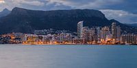 Een 2:1 avondfoto van de skyline van Calpe (Calp), Costa Blanca, Spanje, genomen vanaf het water, met uitzicht op de stad en de omringende bergen op de achtergrond.
