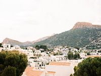 Uitzicht op de mooie stad van Calpe en haar bergen, rond zonsonddergang / golden hour. Witte huisjes, lichte daken en gouden licht.