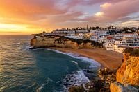 Carvoeiro is een kleine strandplaats aan de zuidkust van de Portugese Algarve. Het is een centrum van toerisme, tussen de spectaculaire rotspartijen aan de kust. Hier zien we het stadje vanaf een uitzichtpunt, in de vroege avond bij een mooie zonsondergang met kleurrijke wolken.