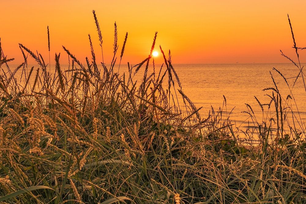 Zonsondergang in het plaatsje Domburg in Nederland. De foto is genomen vanachter de duinen. De zon is nog net zichtbaar en de lucht kleurt prachtig.