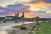 Uitzicht vanaf de Carolabrug over de Königsufer en de Elbe naar de oude binnenstad van Dresden met de katholieke Hofkerk (Cathedral Sanctissimae Trinitatis), het Koninklijk Paleis en de Semper Opera.