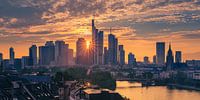 Zonsondergang boven Frankfurts Mainhattan, het centrale zakelijke district van Frankfurt am Main in Duitsland. Het woord is een portmanteau van Main, de rivier waarop Frankfurt ligt, en Manhattan, een verwijzing naar de visueel indrukwekkende hoogbouw en wolkenkrabbers van de binnenstad.