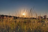 Zonsondergang boven het landschap van het Friese Gaasterland nabij Mirns gezien door het hoge gras op de voorgrond en boven de bomenrij aan de horizon.