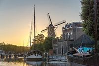 Prachtige zonsondergang bij de Turfsingel in Gouda met molen De Roode Leeuw. In de Turfsingel liggen historische schepen.