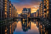 Zonsondergang bij het beroemde Wasserschloss gebouw in de historische Speicherstadt in Hamburg, Duitsland