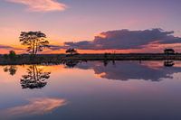 Zonsondergang in Nationaal Park Dwingelderveld, het grootste natte heidegebied van West-Europa. Gelegen in de Nederlandse provincie Drenthe, in de driehoek Dwingeloo, Ruinen en Beilen. Natte laagtes en hoge zandruggen wisselen elkaar af in het uitgestrekte Dwingelderveld. Je vindt er heide, bos, jeneverbesbosjes, stuifzand en ruim veertig vennen. Een deel van die vennen is ontstaan in de ijstijd, andere zijn het resultaat van veenafgravingen.