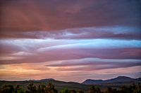 De hemel kleurde rood, geel en paars. Ademloos hebben we een uur staan kijken naar de zonsondergang aan de westkust van Ierland. Aan de ene kant boven het land deze blauwe en paarse pasteltinten, aan de andere kant boven de zee felle kleuren geel en oranje. De vormen van de wolken werden benadrukt door de verschillende kleurtinten.