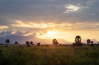 Landschapsfoto van Kidepo nationaal park in het noorden van Oeganda. Dit natuurreservaat kenmerkt zich door de prachtige landschappen die in de vallei tussen de bergen op de grens van Oeganda en Zuid Soedan liggen. Tijdens de kleurrijke zonsondergang zijn de silhouetten van de palmbomen in het groene savanne landschap extra mooi zichtbaar.