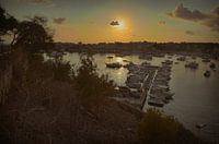 De zonsondergang baadt de haven in een warm, gouden licht dat de serene sfeer versterkt en de contouren van de boten en de kustlijn prachtig accentueert. Elk detail, van de kabbelende golven tot de rustige hemel, wordt versterkt door de HDR-bewerking, waardoor de foto een bijna dromerige kwaliteit krijgt.