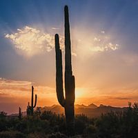 Een vierkante foto van een grote Saguaro cactus tijdens zonsondergang in Lost Dutchman State Park, een 320 hectare groot staatspark in de buurt van de Superstition Mountains, in het zuiden van Arizona, Verenigde Staten.