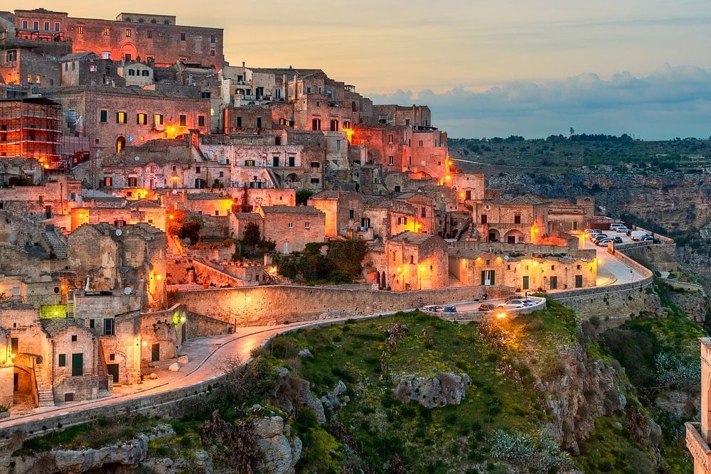 De oude grottenstad Matera in Italië bij zonsondergang