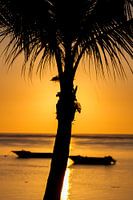 Palmboom en vissersboten voor zonsondergang in Le Morne, Mauritius, Afrika.