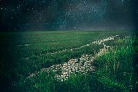 Het beeld is rijk aan koele kleuren die de rust en sereniteit onder de nachtelijke hemel weerspiegelen. Toch straalt het ook een subtiele warmte uit, een gloed die het landschap omhult en een gevoel van verwondering bij de toeschouwer oproept. Deze harmonie van aardse tinten en fonkelende sterren creëert een rustgevend en inspirerend beeld dat uitnodigt tot contemplatie en bewondering.