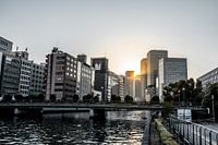 Zonsondergang in Osaka in de buurt van het Namba station tijdens een zonnige avond tussen de hoge gebouwen en bij een rivier.