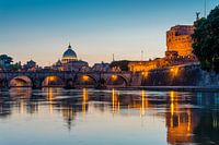 De brug Ponte Sant Angelo over de rivier de Tiber, met het Vaticaan in de achtergrond tijdens een zomer zonsondergang in Rome, Italie.