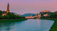 Een 16:9 foto van een avond tijdens zonsondergang langs de Salzach rivier met uitzicht op het Hohensalzburg Fort (Festung Hohensalzburg, letterlijk "Hoog Salzburg-fort"), gelegen bovenop de Festungsberg, een kleine heuvel in de stad Salzburg, in het noorden van Oostenrijk.