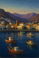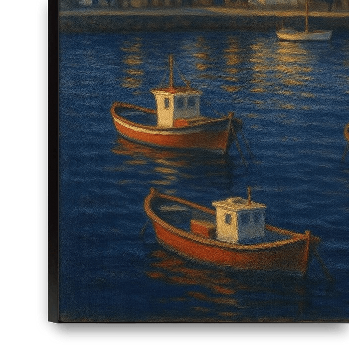 De zonsondergang van San Sebastián vangt het hart van La Gomera in zijn meest rustige uur. Vissersboten liggen rustig in de golvende haven, hun weerspiegelingen schitteren onder een paarse hemel. Achter hen staan witgekalkte huizen en terracotta daken langs de kust, terwijl de omringende bergen vervagen in zachte lila…