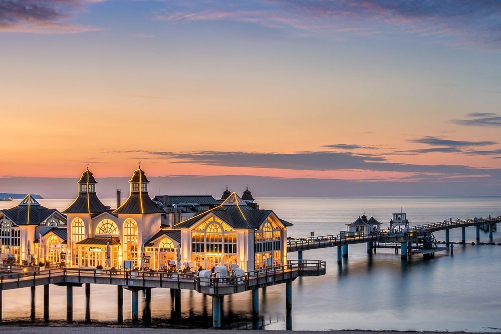 Sellin Pier op het eiland Rügen tijdens zonsondergang, Duitsland