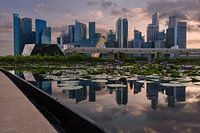 Foto genomen van de wolkenkrabbers in de stad Singapore tijdens zonsondergang, met een reflectie in een kleine vijver.