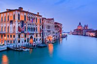 Een avond in Venetië en het uitzicht vanaf de Accademia-brug na zonsondergang tijdens het blauwe uur met uitzicht op het Canal Grande richting Santa Maria Della Salute.