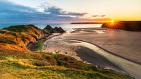 De zon gaat onder en zendt haar laatste stralen van de dag in een mooie baai in Wales.