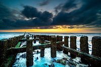 Verweerde houten palen als een golfbreker in de razende golven van de Noordzee aan de Zeelandse kust van Walcheren. Zonsondergang op zonsopkomst boven de kust van Nederland met donkere over drijvende stapelwolken en rood oranje kleren boven een eindeloze horizon.