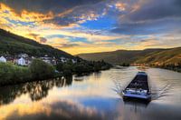 Prachtige opname van het dorpje Zell (an der Mosel) aan rivier de Moezel in Duitsland tijdens een fantastische zonsondergang in de zomer met een binnenvaartschip en reflectie in het water