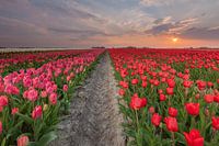 De zon gaat onder boven een bollenveld bij Zijldijk in de provincie Groningen