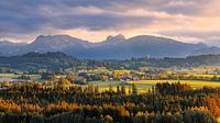 Het panoramische formaat benadrukt de uitgestrektheid en harmonie van het Beierse landschap en legt de vredige schoonheid van de Allgäuer Alpen vast, badend in de zachte warmte van de schemering.