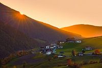 Het laatste licht van de dag en zonsondergang met herfstkleuren in San Pietro / St Peter, gelegen in Villnoess / Val di Funes in de Dolomieten, in zuid-Tirol, Italië.