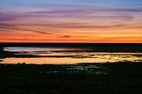Het complementaire kleurenspel icm met het horizontale lijnenspel en de kaarsrechte IJsselmeer dijk in de Noordoostpolder trok mijn aandacht op de terugweg naar de auto. Nog even snel een laatste foto waarbij het moerasachtige natuurgebied een mooie toevoeging gaf aan het geheel. De zon kleurt de hoge bewolking in de lucht prachtig in blauw een rood.